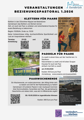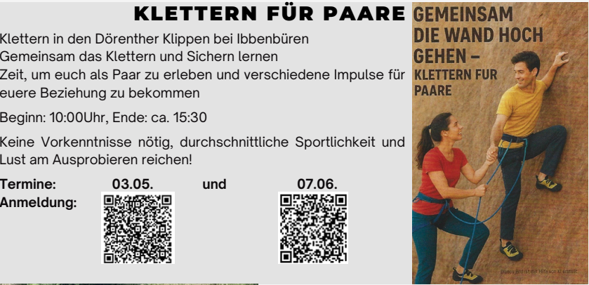 Am 03.05. und am 07.06. habt ihr die Chance einen außergewöhnlichen Tag als Paar zu erleben. Wir gehen in das Klettergebiet "Brumleytal" in den Dörenther Klippen bei Ibbenbüren. Dort werden wir gemeinsam das Klettern und Sichern lernen. Außerdem gibt es Zeit für euch zu zweit und die Möglichkeit, konkrete Impulse für eure Beziehung zu bekommen.