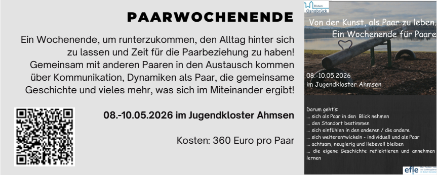 Von der Kunst als Paar zu leben - ein Wochenende für Paare vom 08.-10.05.2026 im Jugendkloster Ahmsen