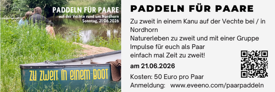 Mit bis zu zehn Kanus paddeln wir eine gut zu bewältigende Strecke auf der Vechte. Jedes Paar bekommt ein Boot und ihr könnt euch ausprobieren: Wer gibt das Tempo vor, wer die Richtung? Wie kommt Ihr in einen gemeinsamen Rhythmus? ... Zwischendurch gibt es Impulse über die Ihr als Paar ins Gespräch kommen könnt. Auch ein Austausch in der Gruppe wird bei den Zwischenstopps möglich sein - bei einem gemeinsamen Picknick. Naturerleben und Spaß gehören unbedingt dazu!